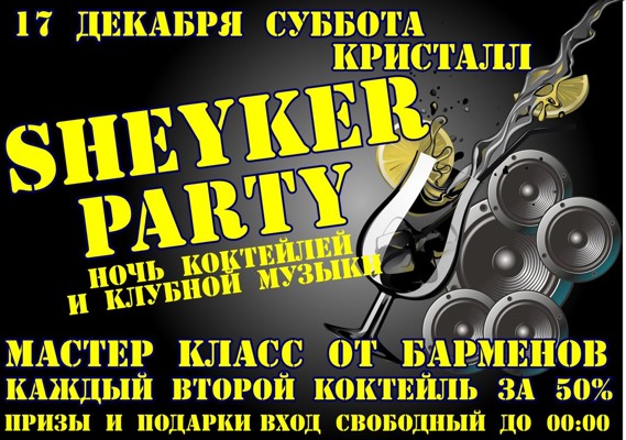 Sheyker Party 17 декабря 16 декабря 2011 12:56 2 Место проведения:Клуб «Кристалл».Адрес: ул. Некрасова, 31/3Справки по телефону: 3-15-25 Поделиться: