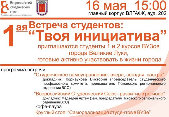 Первая встреча студентов «Твоя инициатива» 16 мая 4 мая 2012 16:10 0 ВЛГАФК16 мая — 15:00Адрес: пл. Юбилейная, 4, корп. 1Контакты: medvedevluki@gmail.com Поделиться: