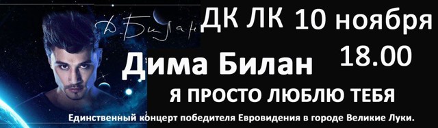 Дима Билан 10 ноября 30 августа 2012 9:42 3 ДК ЛК 10 ноября — 18:00Цена билета: от 1500 до 2100 рублейАдрес: г. Великие Луки, ул. Зверева, д. 29Телефон: 5-72-75 Поделиться: