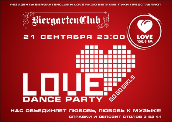 Резиденты BiergartenClub и Love Radio Великие Луки представляют Love Dance программу, обещающую стать легендарной. В честь первого выхода в эфир: Love Dance Party в BiergartenClub. Правила движения для позитивных людей. Сердца, бит и дыхание схлестнутся в безудержном порыве счастья и веселья.