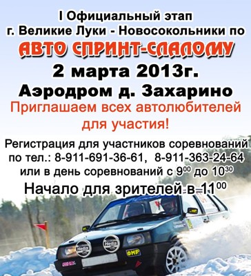 Первенство городов Великие Луки — Новосокольники по автомобильному спринт-слалому. Соревнование будет состоять из 8 этапов, по итогам которых победителю в каждой зачётной группе, будет вручен ценный приз, а также главный кубок соревнования.