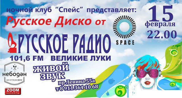 Русское диско от «Русское радио» 15 февраля 6 февраля 2013 16:21 0 Клуб Space15 февраля — 22:00Адрес: пр. Ленина, д. 55аТелефон: +7 911 364 10 68 Поделиться: