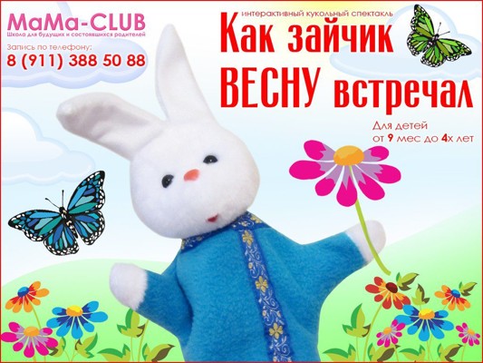 Приглашаем деток и родителей на интерактивный кукольный спектакль «Как Зайчик весну встречал». Вас ожидают увлекательные приключения Зайчика и его друзей, в которых ребёнок будет участвовать вместе с кукольными героями сказки.