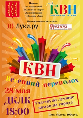 КВН: отменено 28 мая 15 мая 2013 10:46 1 ДК ЛК28 мая — 18:00Цена билета: 100 рублейАдрес: г. Великие Луки, ул. Зверева, д. 29Телефон: 5-72-75 Поделиться: