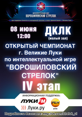 Ворошиловский стрелок 8 июня 28 мая 2013 16:01 3 ДК ЛК8 июня — 12:00Адрес: г. Великие Луки, ул. Зверева, д. 29Телефон: 5-72-75 Поделиться: