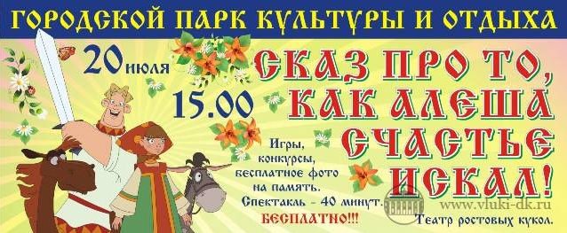 Спектакль ростовых кукол «Сказ про то, как Алеша счастье искал» в городском парке культуры и отдыха.