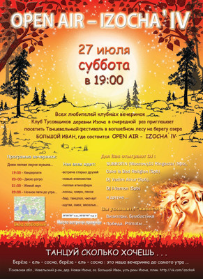 Приглашаем весь цвет прогрессивной молодежи на танцевальный фестиваль «Опен Эир Изоча 4». В волшебном лесу на берегу озера Большой Иван.