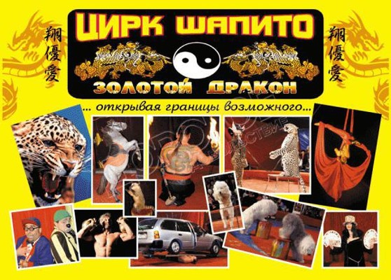 В программе: леопарды, собаки, кошки, макака, носуха, бурый медведь, енот, жонглеры, клоуны, гимнасты, экстремальное шоу «Ки-Хаб», цыганский барон и многое другое. Представление 2 часа 30 минут, шатер отапливается.