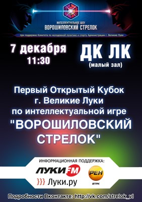 Ворошиловский стрелок 7 декабря 20 ноября 2013 16:57 0 ДК ЛК7 декабря — 11:30Адрес: г. Великие Луки, ул. Зверева, д. 29Телефон: 5-72-75 Поделиться: