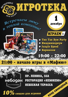 Игротека в Space 1 декабря 27 ноября 2013 22:40 0 Клуб Space1 декабря — 19:00Адрес: пр. Ленина, д. 55аТелефон: +7 911 364 10 68 Поделиться: