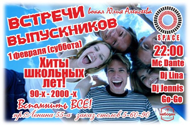 Встречи выпускников 1 февраля 24 января 2014 16:06 0 Клуб Space1 февраля — 20:00Адрес: пр. Ленина, д. 55аТелефон: +7 911 364 10 68 Поделиться: