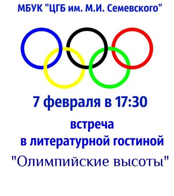 Встреча «Олимпийские высоты» 7 февраля 5 февраля 2014 11:03 0 Центральная городская библиотека имени М. И. Семевского7 февраля — 17:30Адрес: улица Пионерская, дом 7Телефон: 3-73-47, 3-64-59 Поделиться:
