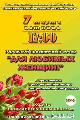 Концерт «Для любимых женщин» 7 марта 3 марта 2014 16:13 0 Великолукский драматический театр7 марта — 17:00Адрес: пр. Октябрьский 28/13Телефон: 3-72-36 Поделиться: