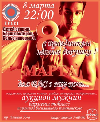 Восьмое марта 8 марта 5 марта 2014 15:59 0 Клуб Space8 марта — 22:00Адрес: пр. Ленина, д. 55аТелефон: +7 911 364 10 68 Поделиться: