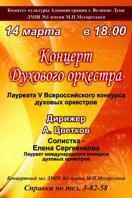 Концерт духового оркестра 14 марта 5 марта 2014 16:07 0 Детская музыкальная школа №1 имени Мусоргского14 марта — 18:00Адрес: пл. Ленина, д. 3Телефон: 3-82-58 Поделиться: