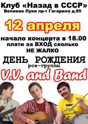 V.V. & Band 12 апреля 5 апреля 2014 11:35 0 Клуб СССР12 апреля — 18:00Адрес: пр. Гагарина, 95Телефон: 4-20-20 Ещё по теме Великолукская группа V.V. and Band отметит 9-летие сольным концертом Поделиться:
