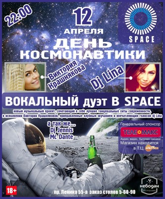 День космонавтики 12 апреля 7 апреля 2014 17:19 0 Клуб Space12 апреля — 22:00Адрес: пр. Ленина, д. 55аТелефон: +7 911 364 10 68 Поделиться: