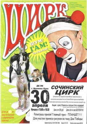 Сочинский цирк 30 апреля 9 апреля 2014 10:26 0 ДК ЛК30 апреля — 13:00, 18:30Адрес: г. Великие Луки, ул. Зверева, д. 29Телефон: 5-72-75 Поделиться: