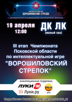 Ворошиловский стрелок 19 апреля 15 апреля 2014 16:02 0 Третий тур чемпионата Псковской области. ДК ЛК19 апреля — 12:00Адрес: г. Великие Луки, ул. Зверева, д. 29Телефон: 5-72-75 Поделиться: