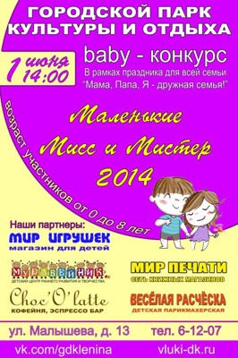 Маленькие мисс и мистер 2014 1 июня 21 апреля 2014 15:29 0 ДК имени Ленина1 июня — 14:00Адрес: ул. Малышева, д. 13Телефон: 6-12-07 Поделиться: