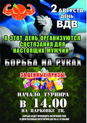 Армрестлинг 2 августа 22 июля 2014 14:23 0 Торговый центр «Апельсин»2 августа — 14:00Адрес: ул. Вокзальная, д.11 Поделиться: