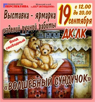 Выставка-ярмарка «Волшебный сундучок» 19 сентября 28 августа 2014 12:45 0 ДК ЛК19 сентябряАдрес: г. Великие Луки, ул. Зверева, д. 29Телефон: 5-72-75 Поделиться: