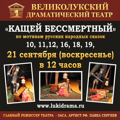 Кащей Бессмертный с 10 сентября 29 августа 2014 20:16 0 Сказка Великолукский драматический театрАдрес: пр. Октябрьский 28/13Телефон: 3-72-36 Поделиться: