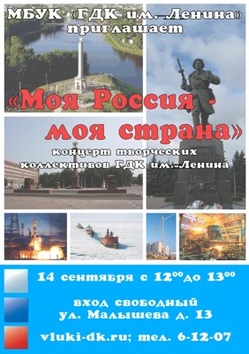 Концерт «Моя Россия — моя страна» 14 сентября 2 сентября 2014 14:30 0 ДК имени Ленина14 сентября — 12:00Адрес: ул. Малышева, д. 13Телефон: 6-12-07 Поделиться: