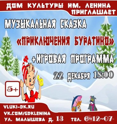 Буратино 22 декабря 17 ноября 2014 16:15 0 ДК имени Ленина22 декабря — 18:00Адрес: ул. Малышева, д. 13Телефон: 6-12-07 Поделиться: