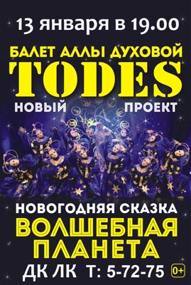 Балет «Тодес» 0+ 28 ноября 2014 14:23 0 ДК ЛК13 января — 19:00Адрес: г. Великие Луки, ул. Зверева, д. 29Телефон: 5-72-75 Поделиться: