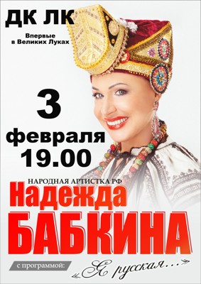 Надежда Бабкина 12+ 2 декабря 2014 10:12 0 ДК ЛК3 февраля — 19:00Адрес: г. Великие Луки, ул. Зверева, д. 29Телефон: 5-72-75 Поделиться: