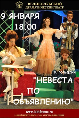 Невеста по объявлению 16+ 14 декабря 2014 22:21 0 Великолукский драматический театр9 января — 18:00Адрес: пр. Октябрьский 28/13Телефон: 3-72-36 Поделиться: