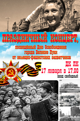 Праздничный концерт 6+ 22 декабря 2014 12:19 0 ДК ЛК17 января — 17:00Адрес: г. Великие Луки, ул. Зверева, д. 29Телефон: 5-72-75 Поделиться: