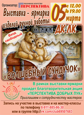 Выставка-ярмарка «Волшебный сундучок» 6+ 23 января 2015 13:57 0 ДК ЛК5 мартаАдрес: г. Великие Луки, ул. Зверева, д. 29Телефон: 5-72-75 Поделиться: