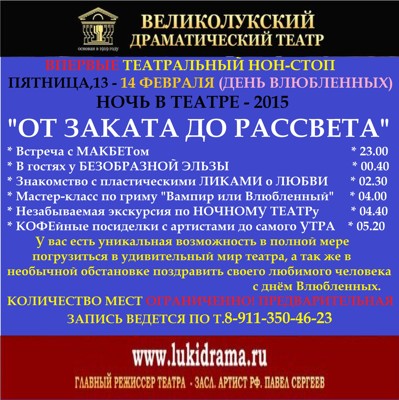 Ночь в театре 16+ 3 февраля 2015 11:12 0 Великолукский драматический театр14 февраляАдрес: пр. Октябрьский 28/13Телефон: 3-72-36 Поделиться: