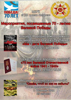 Мероприятия к 70-летию Победы 6+ 16 февраля 2015 11:40 0 ДК имени Ленинас 13 февраляАдрес: ул. Малышева, д. 13Телефон: 6-12-07 Поделиться: