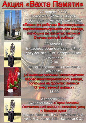 Вахта памяти 6+ 16 февраля 2015 11:42 0 ДК имени Ленина27 — 29 апреляАдрес: ул. Малышева, д. 13Телефон: 6-12-07 Поделиться: