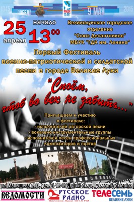 Фестиваль «Споем, чтоб вовек не забыть» 16+ 24 марта 2015 19:43 0 ДК имени Ленина25 апреля — 13:00Адрес: ул. Малышева, д. 13Телефон: 6-12-07 Поделиться: