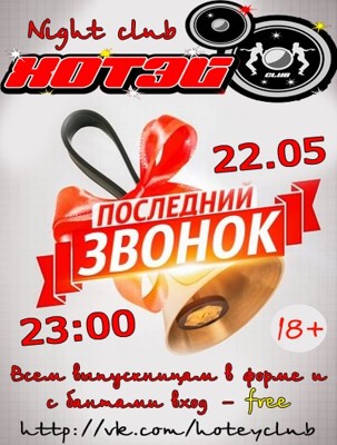 Последний звонок 16+ 22 мая 2015 10:56 0 Клуб «Хотэй»22 мая — 23:00Адрес: пр. Гагарина 118Телефон: +7 911 352 51 52 Поделиться: