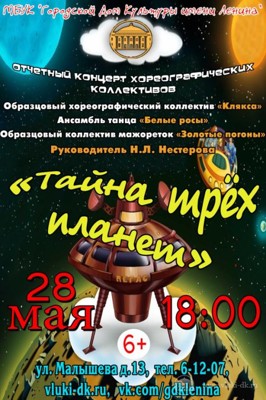 Концерт «Тайна трех планет» 6+ 25 мая 2015 10:57 0 ДК имени Ленина28 мая — 18:00Адрес: ул. Малышева, д. 13Телефон: 6-12-07 Поделиться: