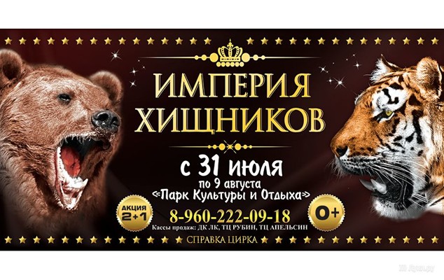 Цирк-шапито «Империя хищников» 0+ 14 июля 2015 15:53 0 Парк культуры и отдыха31 июля — 9 августаАдрес: Краснофлотская набережнаяТелефон: +7 960 222 09 18 Поделиться: