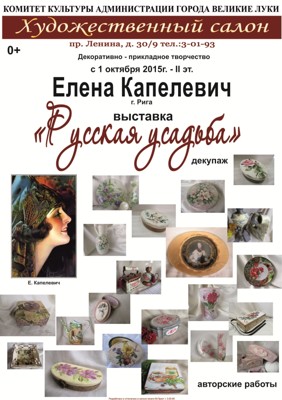 Выставка «Русская усадьба» 0+ 2 октября 2015 23:28 0 Выставочный зал художественного салона Адрес: пр. Ленина 30/910.00 — 19.00 Выходной: воскресеньеТелефон: 3-01-93 Поделиться: