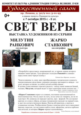 Выставка «Свет веры» 6+ 7 октября 2015 16:12 0 Выставочный зал художественного салона Адрес: пр. Ленина 30/910.00 — 19.00 Выходной: воскресеньеТелефон: 3-01-93 Поделиться: