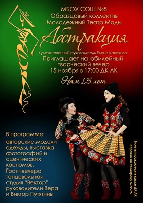 15 лет театру «Абстракция» 6+ 21 октября 2015 19:38 0 ДК ЛК15 ноября — 17:00Адрес: г. Великие Луки, ул. Зверева, д. 29Телефон: 5-72-75 Поделиться:
