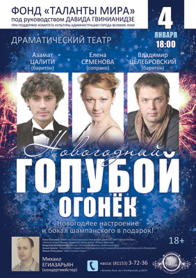 Голубой огонек 18+ 8 декабря 2015 11:59 0 Пластический спектакль на тему любвиВеликолукский драматический театр4 января — 18:00Адрес: пр. Октябрьский 28/13Телефон: 3-72-36 Поделиться: