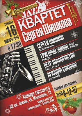 Джаз-квартет Сергея Шишкова 6+ 29 декабря 2015 9:38 0 ДК имени Ленина16 января — 17:30Адрес: ул. Малышева, д. 13Телефон: 6-12-07 Поделиться: