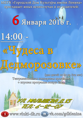 Чудеса в Дедморозовке 0+ 30 декабря 2015 9:54 0 ДК имени Ленина6 января — 14:00Адрес: ул. Малышева, д. 13Телефон: 6-12-07 Поделиться:
