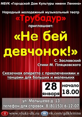 Не бей девчонок! 6+ 21 января 2016 18:11 0 ДК имени Ленина28 января — 18:00Адрес: ул. Малышева, д. 13Телефон: 6-12-07 Поделиться: