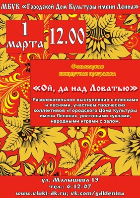 Концерт «Ой, да над Ловатью» 6+ 10 февраля 2016 16:30 0 ДК имени Ленина1 марта — 12:00Адрес: ул. Малышева, д. 13Телефон: 6-12-07 Поделиться:
