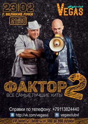 Фактор-2 18+ 17 февраля 2016 17:49 0 Клуб «Вегас»23 февраля — 21:00Адрес: проспект Гагарина, 118Телефон: +7 911 382 24 40 Поделиться: